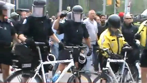 Wow. When did citizens lose the right of public assembly? I have no time for vandals and violent protesters but it shocks me to see peaceful demonstrators attacked, like those singing the national anthem and posing no risk of violence to anyone. They sure as hell weren't blocking traffic either because the streets were closed.