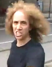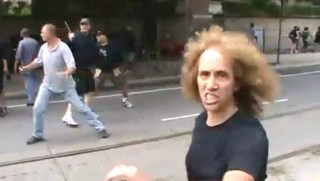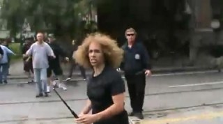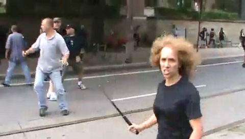 Is the angry woman in the first picture holding the collapsible baton supposed to be an anarchist or a plain clothes officer?