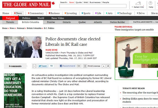 The Globe and Mail’s western bureau has usually ranked ahead of Postmedia newspapers in its coverage of British Columbia politics although that is like winning a $500 claiming race in which the other nags are lame. Online writers, particularly Alex Tsakumis, have written concisely about the Globe’s faulty analysis of the Basi Virk case (Llinks at BC Rail-Alities above) so I’ll add only one small shot.