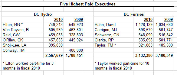 Slashing of BC Ferries top salaries enabled senior executive compensation to rise by six to nine percent. David Hahn’s total compensation rose by $93,500 in 2010. I’ve made comparisons to other ferry operators in the world and that review leaves the conclusion that David Hahn must be a very strong negotiator, at least when he deals with his Board of Directors over issues of compensation.