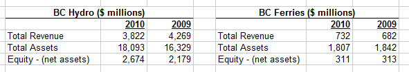 I thought it made sense to compare BC Ferries to BC Hydro, another iconic monument from the days of W.A.C. Bennett. The power utility is larger, by any measure. With more employees, BC Hydro has more than five times the annual revenue and ten times the assets of the ferry corporation. It annually contributes hundreds of millions to the provincial treasury while BC Ferries takes $100 million a year in subsidy.