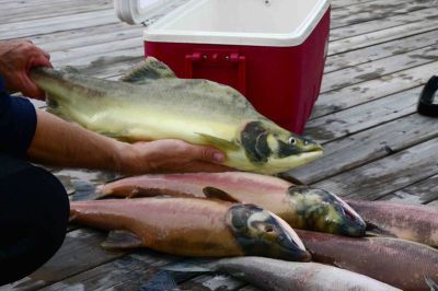 I am now examining the brains of these dying salmon myself, because I have lost all confidence in DFO. On my trip up the Fraser River two days ago I also found four yellow pink salmon.