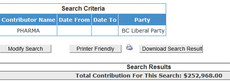 I don’t pretend this is a comprehensive report of money that has flowed from the prescription drug industry to provincial politicians but the screen captures below show indicators. Reality will be far worse because contributions can be routed through so many paths. I simply searched the term “Pharma” in Elections BC Financial Reports and Political Contributions System:
