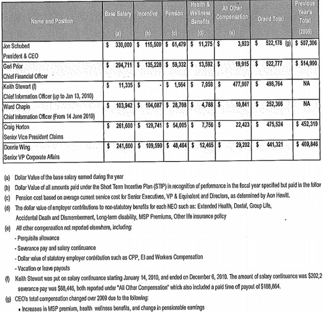 The figures shown above were taken from ICBC “Statements and Schedules of Financial Information.” The numbers are incomplete and may not include all compensation, particularly when an employee has been on paid leave, salary continuance or is receiving severance pay. For example, Keith Stewart, who left his position January 13, 2010, is reported in the 2010 Executive Compensation Disclosure Statement to have total compensation of $498,764 as shown here: