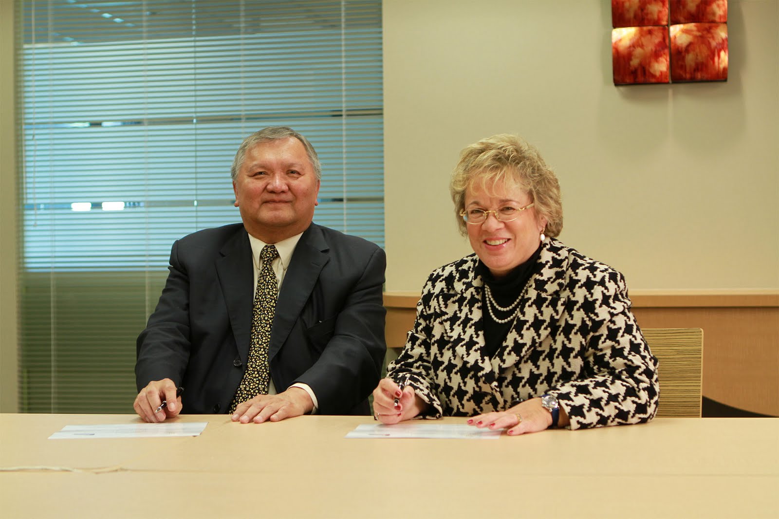 Elmer Derrick and Enbridge VP pose in her longhouse