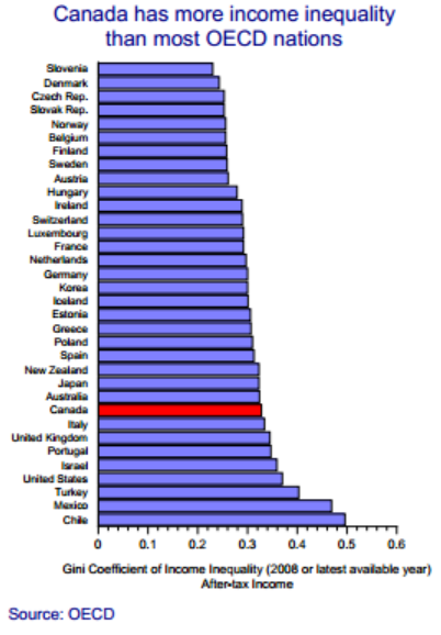 “Based on data from 2008, the average income of the top 10% of Canadians was ten times higher than the bottom 10%, which is a significant increase from the early 1990s, when the ratio was eight to one. The OECD report attributed the growth in inequality to a combination of factors, including increasing disparity in the wages for high and low-paid workers, an increase in the number of selfemployed (since they tend to earn less than employees), as well as a drop in the redistribution of income through taxes and benefits.