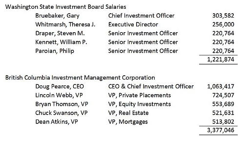 In other words, the bcIMC manages funds worth 40% more than WSIB but incurs administrative costs 345% higher than the American agency. Much of that difference is caused by vastly different executive remuneration. Here is a comparison of the five top paid management people in 2011: