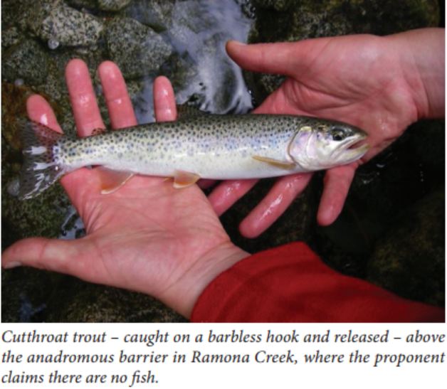 Poul Bech, a former B.C. fisheries technician who has conducted such assessments for the province, accompanied by Rick Hafele, a professional entomologist from Oregon, have caught and released cutthroat trout well above what NI Holding Corp. describes as the anadromous barrier. (See photo on previous page.)