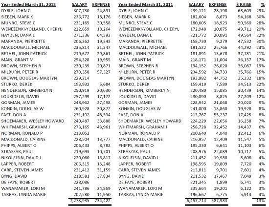 Well, almost everyone. Here’s a list of 31 Deputy Ministers and Associate Deputy Ministers. Collectively, their salaries jumped by 13% in the fiscal year ended March 31, 2012.