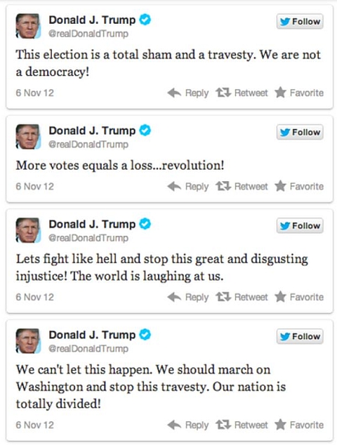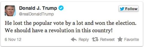 In the final result reported November 20, Obama leads Romney in popular vote by 3.5 million votes. Donald Trump deleted a number of intemperate calls for revolution, but says,