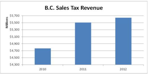 According to public accounts for the fiscal year ended March 31 2010, provincial sales tax revenue was $4.76 billion. In fiscal 2011, with nine months of HST, sales tax revenue was $5.51 billion. Rather than dropping as Colin Hansen predicted, it was up more than $700 million.