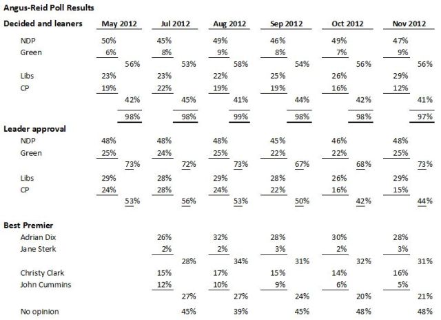 I have to respectfully disagree with some of your points Norm. While you are right that the “horserace” numbers are within the margin of error, some other findings are notable. Your readers may want to check my analysis of the Angus Reid Poll and interview with pollster Mario Canseco in The Tyee today or at my blog – http://billtieleman.blogspot.ca/2012/11/bc-premier-christy-clark-exiting.html – comments welcome at both.