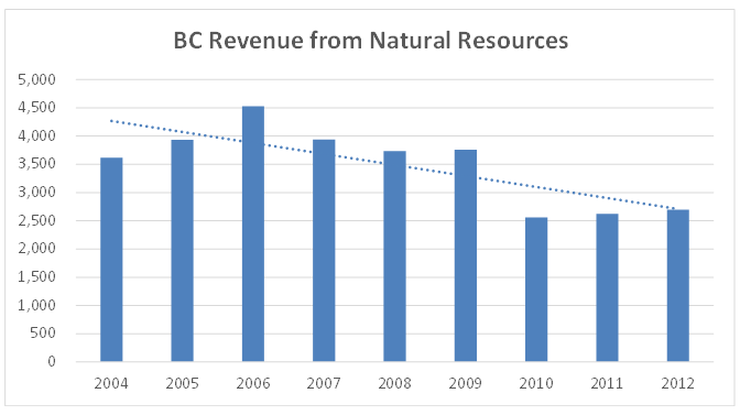 So, if gas production experienced “phenomenal growth” and commodity prices have been through a cycle of high prices, I wonder why the natural resource revenues to government look like this: