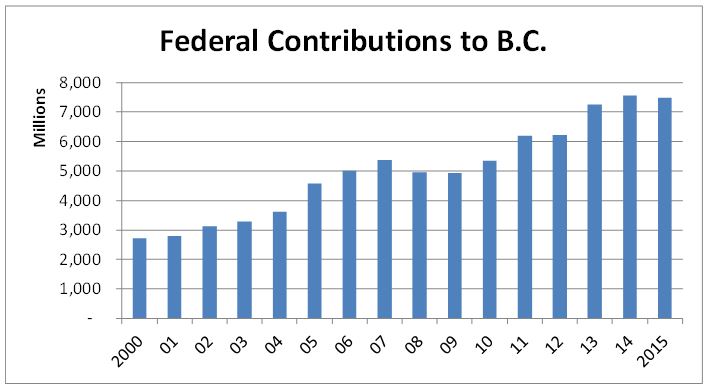 A question was posed in comments about repaying the federal government’s $1.6 billion transition grant. Rather than trying to determine if we did or will send that money to the feds, let’s look at the history of federal contributions to the BC budget and the estimates for the next three years.