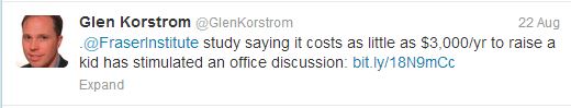 “Yesterday, the Fraser Institute released a study they say shows the cost of raising a child is not the $10,000 a year assumed by other experts, but a mere $3,000. The total left out extra housing, transportation and child care. Some Canadian parents had their own take on FI’s calculation…”