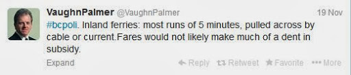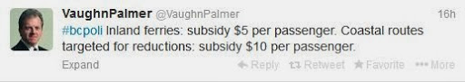 Palmer's tweets don't surprise. On CKNW Friday with Good and Baldrey, the three of them sounded like paid PR agents for BC Ferries. Could they be targeting a well paid road show gig when the 20 or so ferry directors and commissioners have their next soiree?