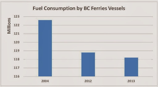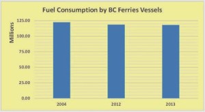 Not quite as impressive. But wait. BC Ferry’s traffic has been steadily declining. In 2013, vehicle and passenger movements were 27.7 million and in 2004, the total was 31.3 million. So, if we look at litres of fuel consumed for each unit of traffic, changes in fuel consumption look like this.