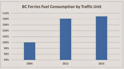 Indeed, the quantity of fuel expended to haul one vehicle or one passenger on a BC Ferries route increased, on average, by 9% since 2004. Truth, my friends, is opposite of what the ferry corporation and its media echo chamber wants you to know.