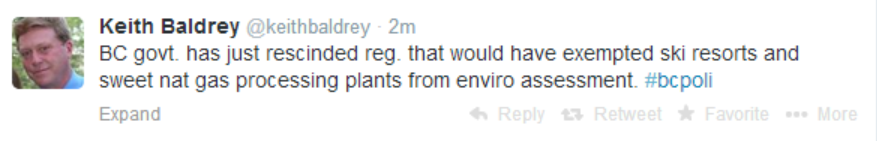 Ignoring its stated role, to ensure development at one large and controversial project indicates the fix is in. The decision is already made. Environment Minister Mary Polak simply removed her department from further review. Fortuitously, she had booked time with Vaughn Palmer’s Voice of BC and the two of them will be able to explain government actions before controversy mounts.