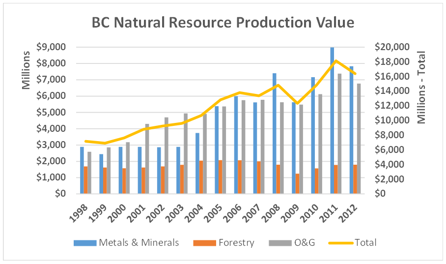 Note: revenue amounts are drawn from public accounts; production values are from Natural Resources Canada reports, Mineral Production of Canada, by Province.
