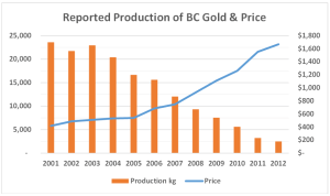 The BC government’s political dedication to collecting resource revenues is one issue; another is it ability to monitor production and enforce existing tax rules. Because of aggressive staff cuts and its “red-tape” reduction policy, the Liberal government lost ability to enforce laws and regulations and began to rely on self-reporting by producers. Complete accuracy may not be important for coal with values over five years ranging from 11¢ to 22¢ per kg. but it is vital for gold, which has moved between $35,000 and $54,000 per kg.