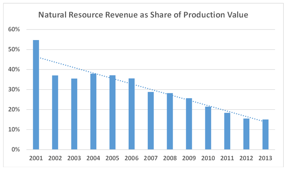 Producers paid less to extract public resources, even though rising prices increased their ability to pay. This shows the value of resources produced.