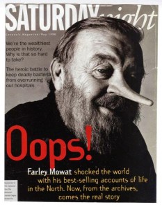 “Farley Mowat detailed government treatment of the Ihalmiut, First Nations people in Canada’s northern lands. His accounts, which described famine and epidemics of disease, were vigorously denied by churches, industry, and government and earned Mowat the nickname “Hardly Knowit.” The denials continued for decades, culminating in the 1990s with Saturday Night’s infamous cover graphic of Mowat with a Pinocchio nose.