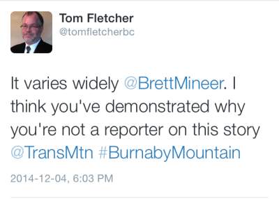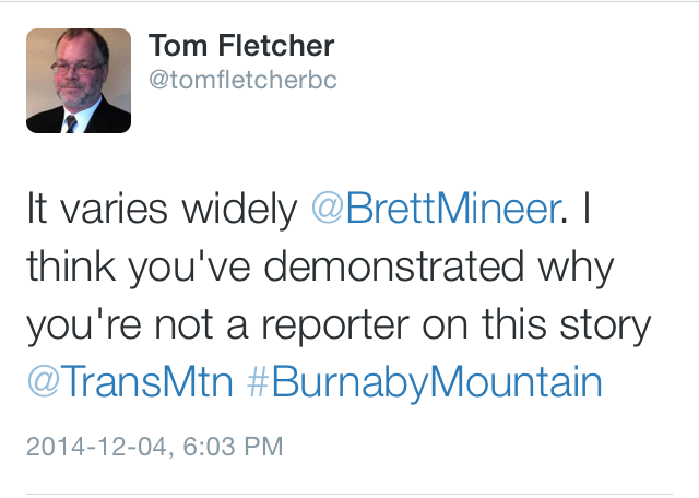 In early December, protests were well underway on Burnaby Mountain over test holes Kinder Morgan contractors were drilling in an effort to gather data for their proposed expansion of the Trans Mountain Pipeline. There had been over 100 arrests by this time and the rhetoric was heated, including from the President of the Legislature Press Gallery, the Black Press man in Victoria, Tom Fletcher. Once upon a time his dual role of columnist and reporter might have been thought to have been incompatible – but not these days.