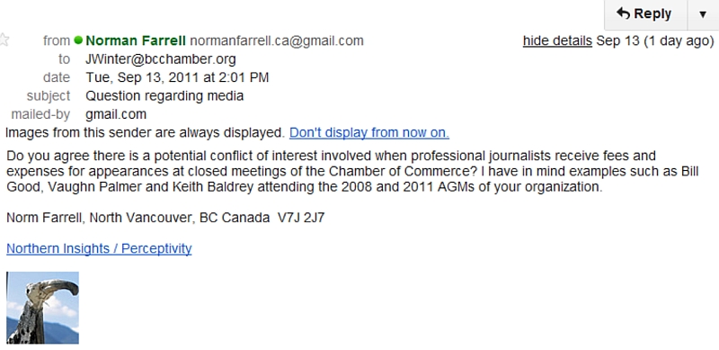Do you agree there is a potential conflict of interest involved when professional journalists receive fees and expenses for appearances at closed meetings of the Chamber of Commerce? I have in mind examples such as Bill Good, Vaughn Palmer and Keith Baldrey attending the 2008 and 2011 AGMs of your organization.