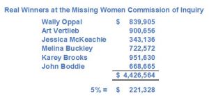 To put the income of Oppal and friends in context, from Statistics Canada we learn that the median family income of British Columbians in 2010 was $66,970, about $3,000 below the national average. According to the Conference Board of Canada, one of the country’s five census divisions with the lowest median income is in Northern British Columbia. From that territory are drawn some of the missing and murdered women that were subjects of Wally Oppal’s inquiry.