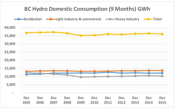 According to BC Hydro’s report for the nine months ended December 31, 2015, domestic consumption of electricity is down 2.2% from the same period 10 years prior.