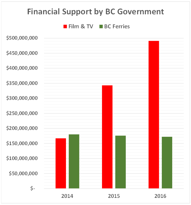 BC Liberals have other priorities. One of them is providing film and video producers with subsidies. Those have tripled to $491 million since the Premier spoke about ferry supports being unsustainable.
