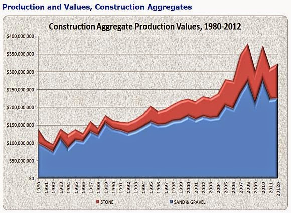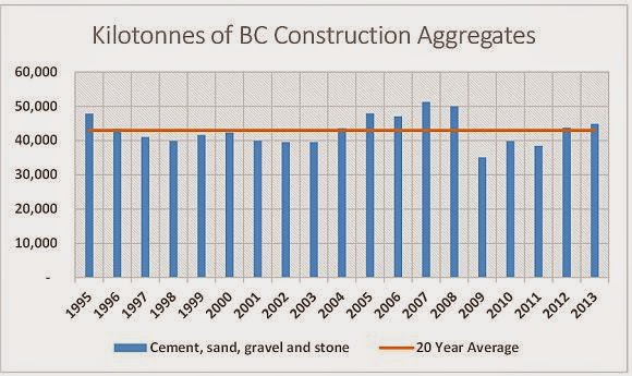 The value graph shows steady increase but a chart of kilotonnes produced, from numbers provided by Natural Resources Canada, shows fairly steady quantities. Despite growth in the province’s economy of more than 20%, three of the last five years are less than the 20 year average.