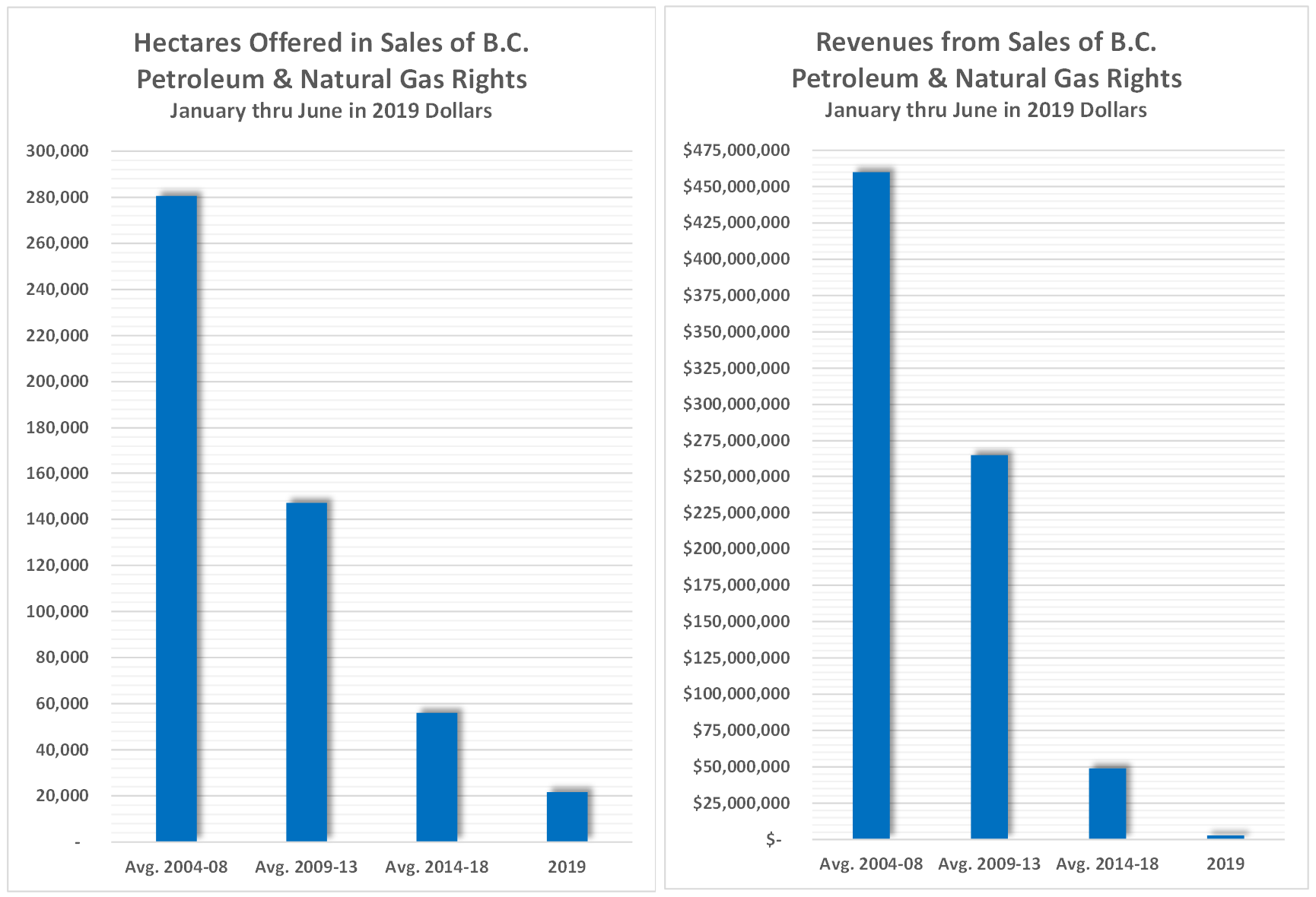 In 2008, British Columbia gained $3.2 billion from sale of petroleum and natural gas rights. If the second half of 2019 matches the first, revenue from right offerings for the year will amount to $5 million, less than 1/5 of one percent of 2008, despite substantially increased production of natural gas.