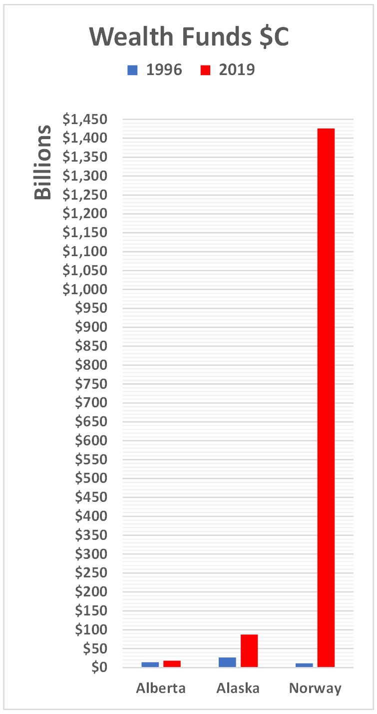 Although it was the least valuable 23 years ago, the size of Norway’s national wealth fund in 2019 is 16 times that of Alaska’s and 78 times the amount of Alberta’s fund.