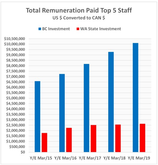 The highest paid executive at Washington State Investment Board, an agency that has outperformed BCi over time, was paid one-quarter of the remuneration earned by his BC counterpart, after adjusting US dollars to Canadian.