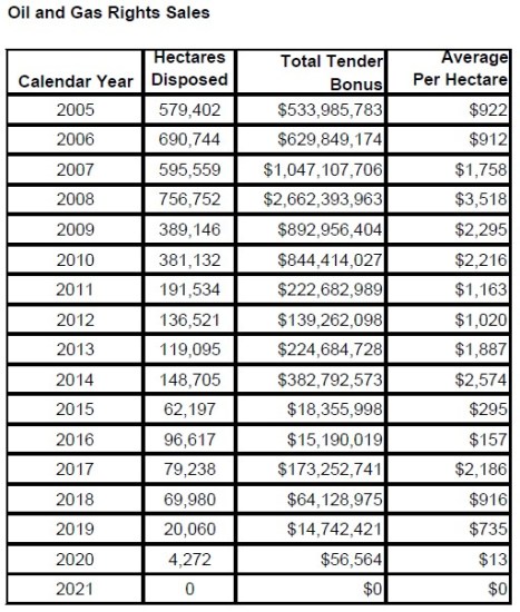 Now, once lucrative payments to the province for rights to explore for and produce natural gas have hit zero. This data, taken today from a government website references the bonus bids for oil and gas rights.