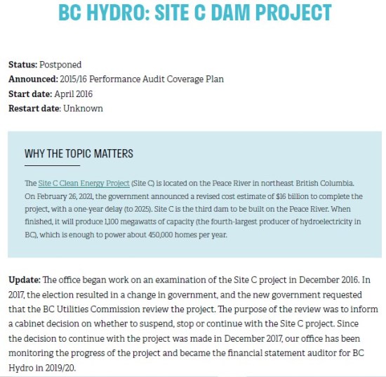 When Site C’s massive problems—apparent to anyone paying attention—were finally admitted by secretive politicians and public officials, the Auditor General of BC remains unconcerned, deeming the project unworthy of close examination until some time in the far off future when nothing can be done to repair the damage.