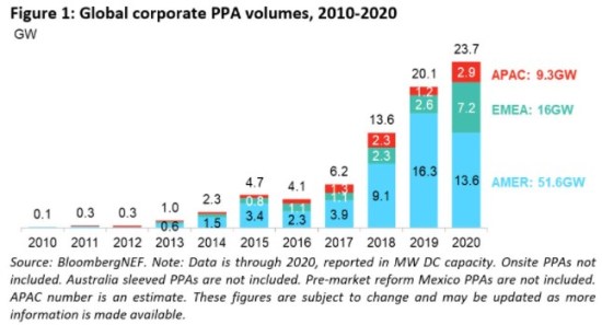 Corporations purchased a record of 23.7GW of clean energy in 2020,.. The increase came despite a year devastated by the Covid-19 pandemic, a global recession and uncertainty about U.S. energy policy ahead of the presidential election.