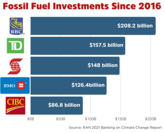 Canada’s five biggest banks are among the top funders of fossil fuels in the world. Since the Paris Agreement was signed in 2016, Canadian banking giants RBC, TD, Scotiabank, BMO, and CIBC have poured over $720 billion into climate-destroying fossil fuel companies — providing the corporations most responsible for the climate crisis continued funds to grow.