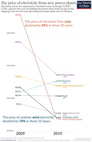 According to Lazard’s 2020 Levelized Cost of Energy Analysis, the cost of solar energy has fallen 90% since 2009 and the cost of wind energy has fallen 71%. Solar and wind energy now have a levelized cost lower than any other form of new electricity generation in the United States.