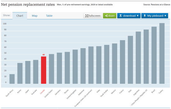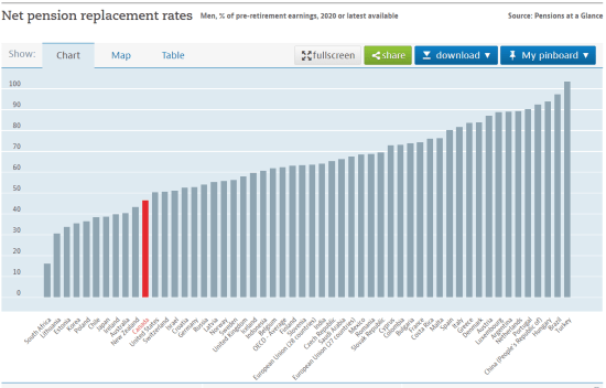 Context is important. For example, Costa Rica is a good example with a high net replacement rate of 107%, but with a seniors’ poverty rate twice that of Canada.
