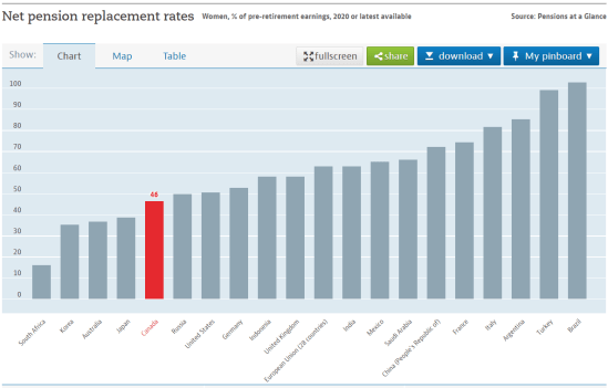 According to OECD, Canada does a little better in terms of gender gap for pensions but still ranks below the middle: