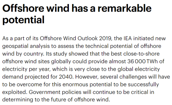 The shift to wind power is just beginning. International Energy Agency (IEA) calculated offshore wind could almost meet global electricity demand projected for 2040. According to IEA, offshore wind: