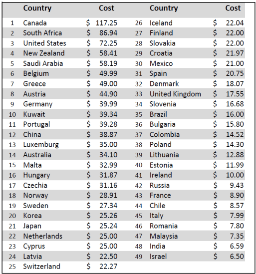 • The minimum monthly price for a smartphone plan that includes 20 gigabytes in Canada is the highest among 51 European, American, Asia Pacific, Middle East and African countries.