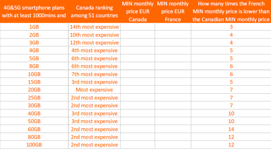 • During September 2021 the MIN monthly price for a 4G&5G smartphone plan with at least 1,000 mins, 10 Mbit/s and 100 gigabytes was 13x more expensive in Canada than in France.