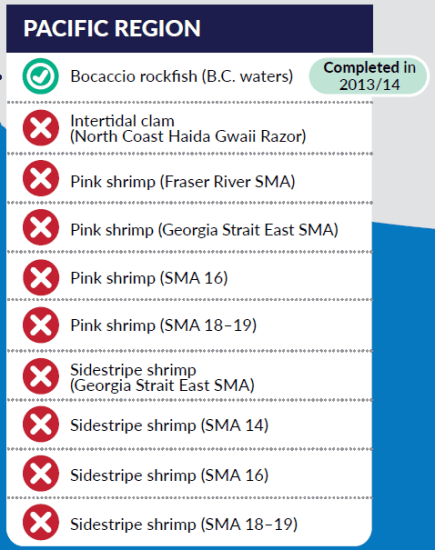 Sadly, only 30% of Canadian fish stocks are known to be healthy. That number may be higher but DFO lacks the data to form a conclusion. Where there is knowledge, there is often no plan to protect the resource. Since much of DFO’s budget is spent in Ottawa, it is not surprising to learn the west coast is particularly poorly served by DFO. Here Oceana indicates the status of stock rebuilding plans. the X means no plan exists.
