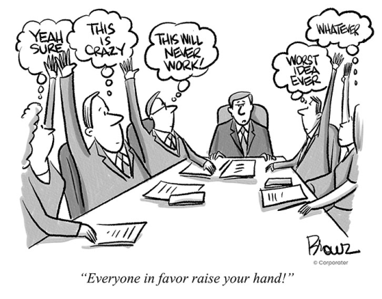 Groupthink is a phenomenon that occurs when the desire for group consensus overrides people’s common sense desire to present reasonable alternatives, critique a position, or express an unpopular opinion. Here, the desire for group cohesion effectively drives out good decision-making and problem solving.