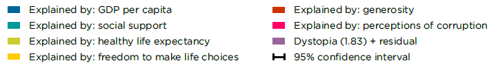 Ten countries ranked highest for happiness are shown here. Although fifth 10 years ago, Canada placed 15th, the lowest ever, just ahead of the USA. While this country ranked lower in per capita GDP than the southern neighbour, it was higher in healthy life expectancy and freedom to make life choices.