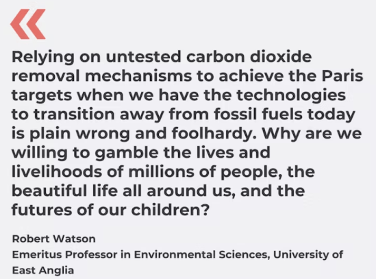 In principle there is nothing wrong or dangerous about carbon dioxide removal proposals… The problems come when it is assumed that these can be deployed at vast scale. This effectively serves as a blank cheque for the continued burning of fossil fuels and the acceleration of habitat destruction.